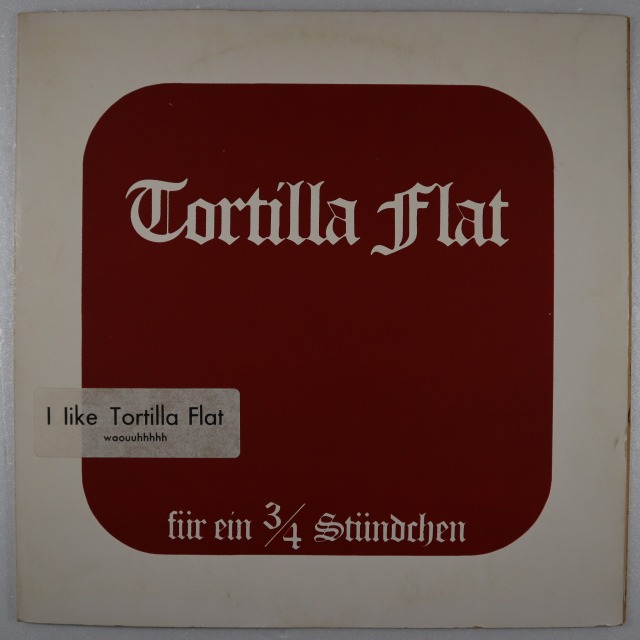In the realm of private pressing in Germany, where many items are highly sought after, there exists a particularly striking, skillful prog jazz rock. It is clearly influenced by Canterbury school, Jethro Tull, and Supersister, and is both technical and imbued with a psychedelic tendency. The gatefold cover, with an inner sleeve attached inside, is prone to damage. However, it appears to have been handled with care, as there are no noticeable damages. On the left side of the front cover, there is a sticker reading 'I Like Tortilla Flat waouuhhhhh,' which is not commonly seen elsewhere. It seems to match well, suggesting it is likely from the time of release. Yes, it has silkscreening on the front cover, and the labels have a white background (counterfeits are unsilkscreened with beige labels).